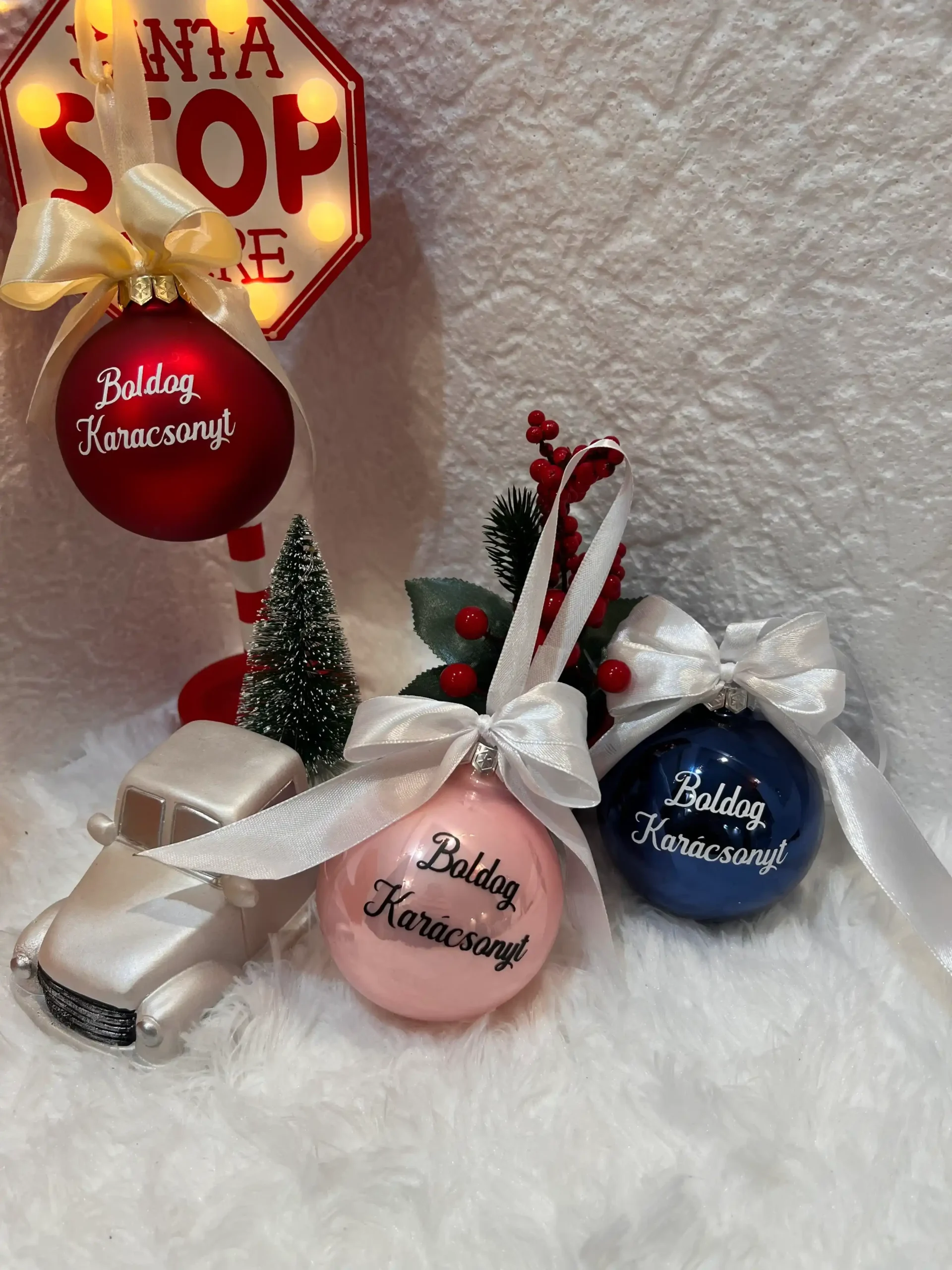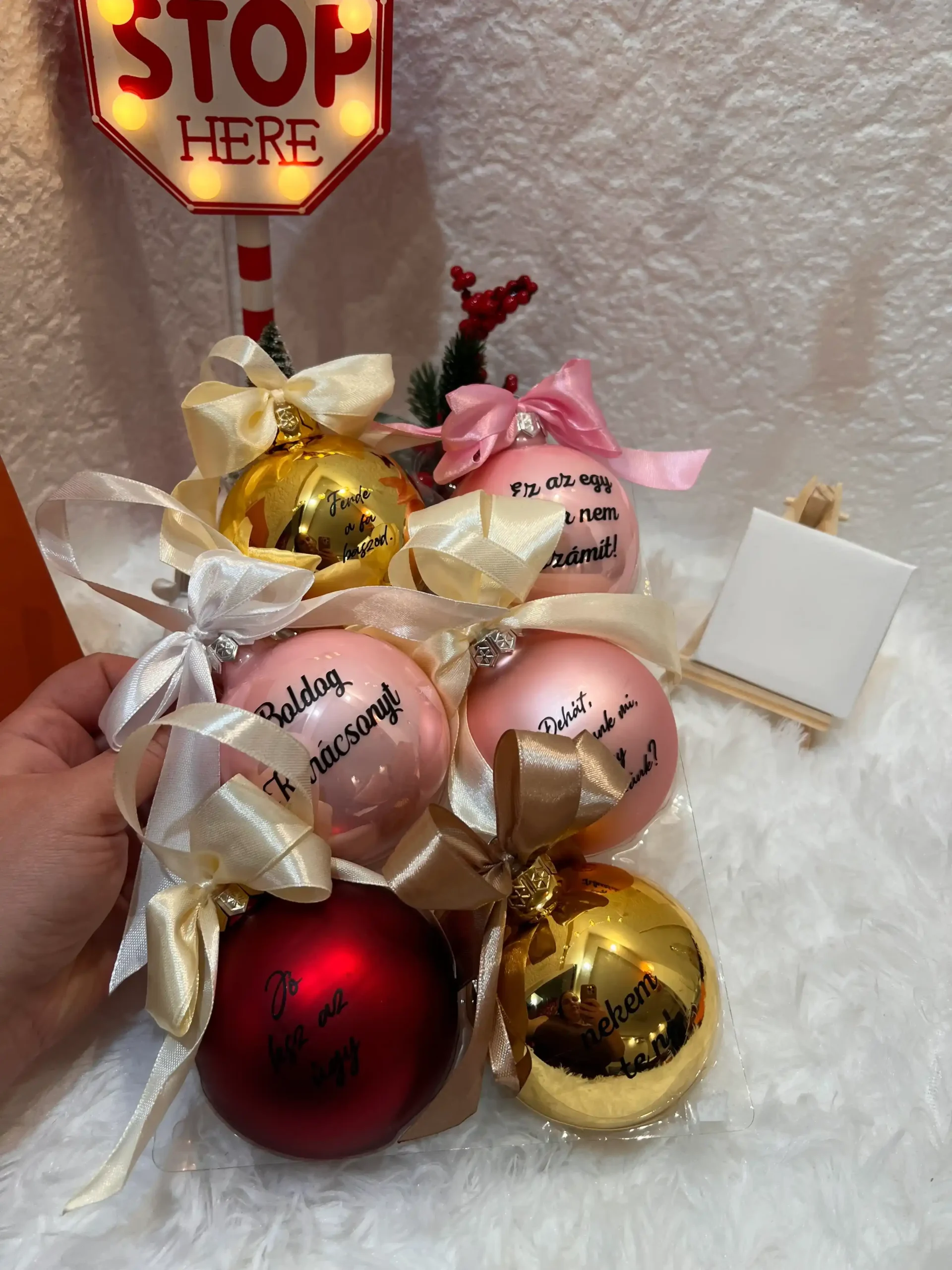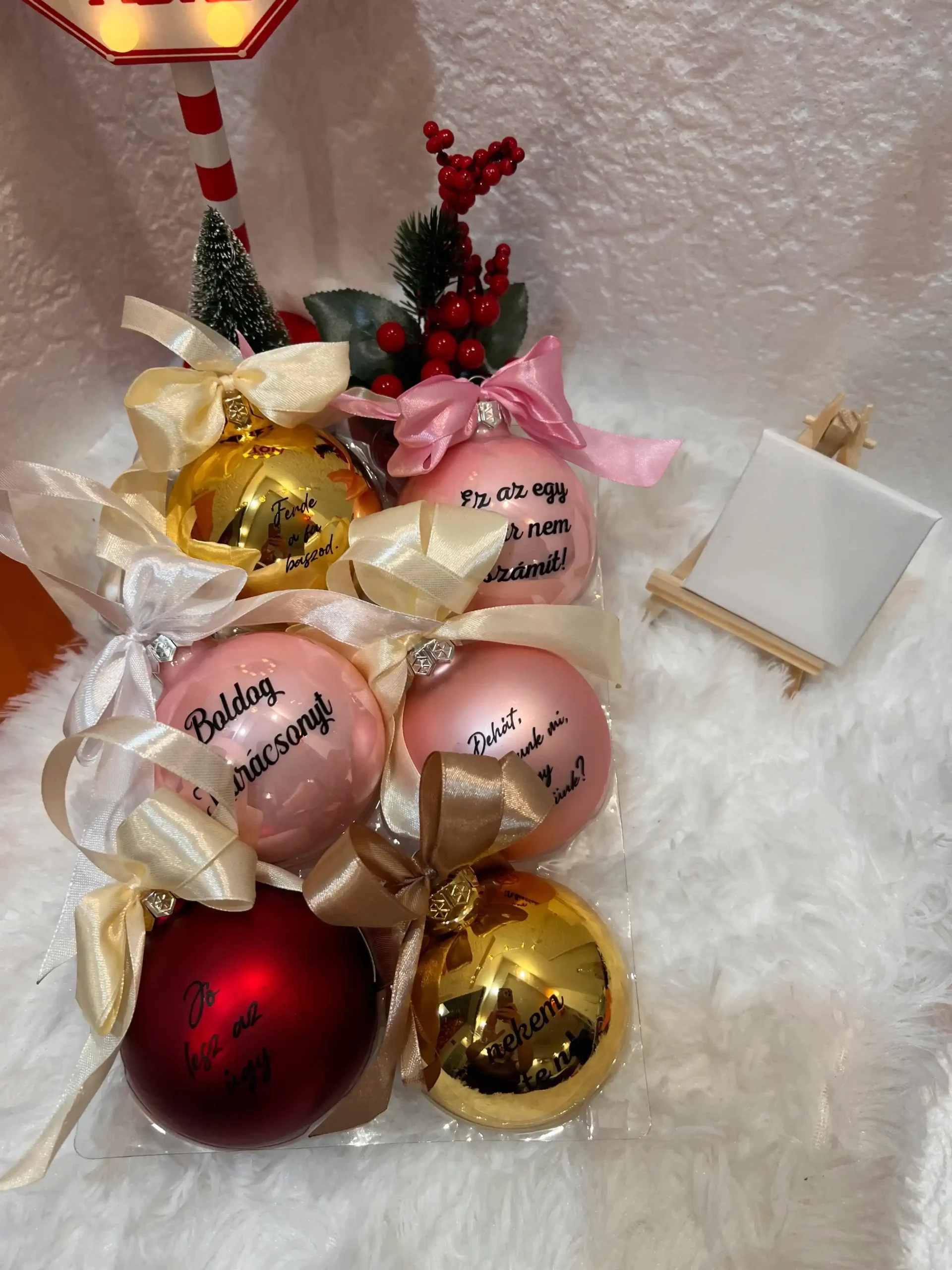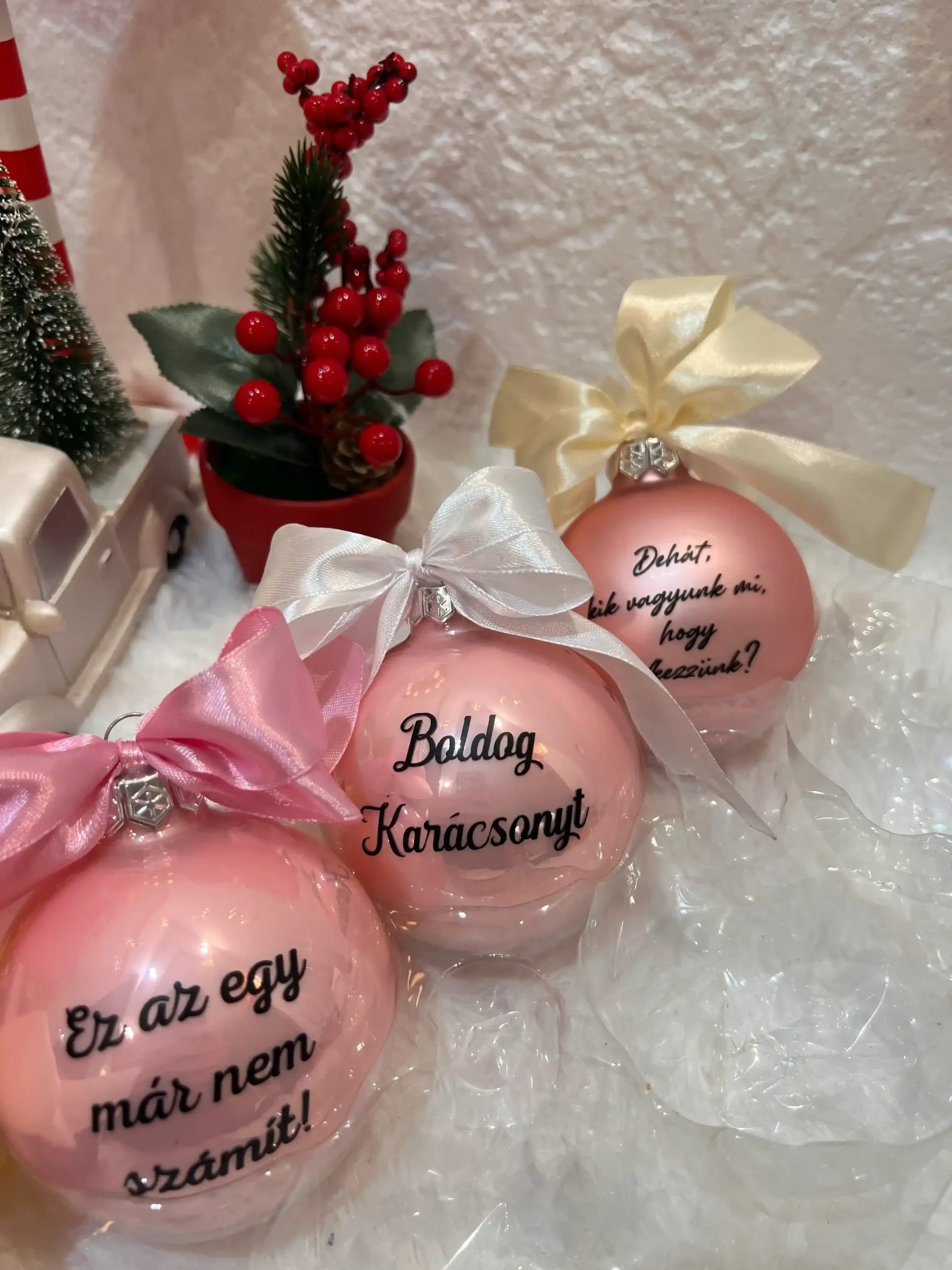Lepd meg magad vagy szeretteidet egy igazán egyedi karácsonyfadísszel, amely garantáltan mosolyt csal az arcokra! Ezek a kézzel készített, 8 cm-es üveg karácsonyfagömbök a megszokott ünnepi dekoráció helyett humoros, egyedi feliratokkal visznek nevetést és személyiséget a karácsonyfára.