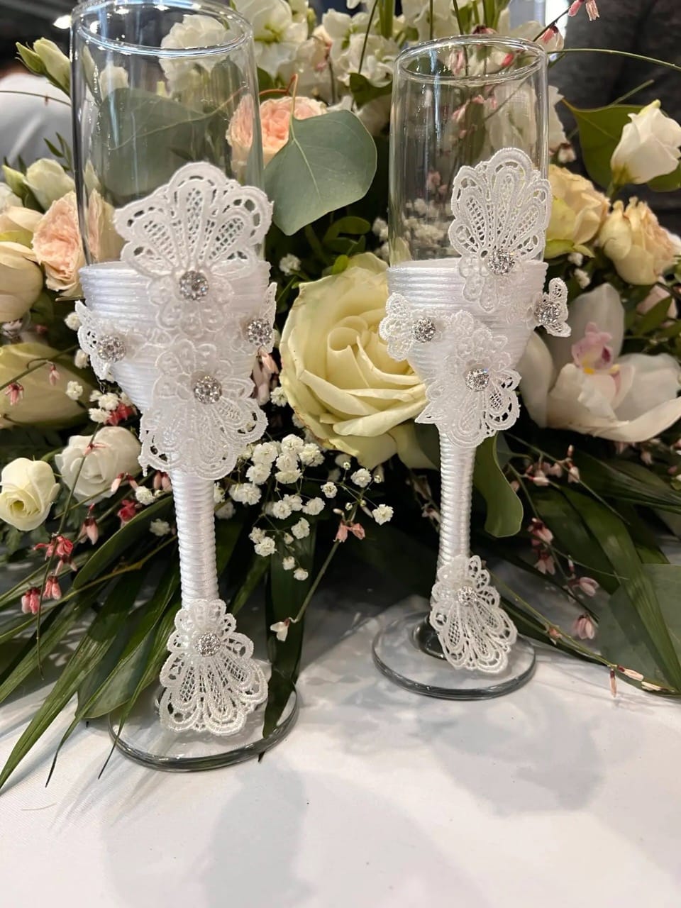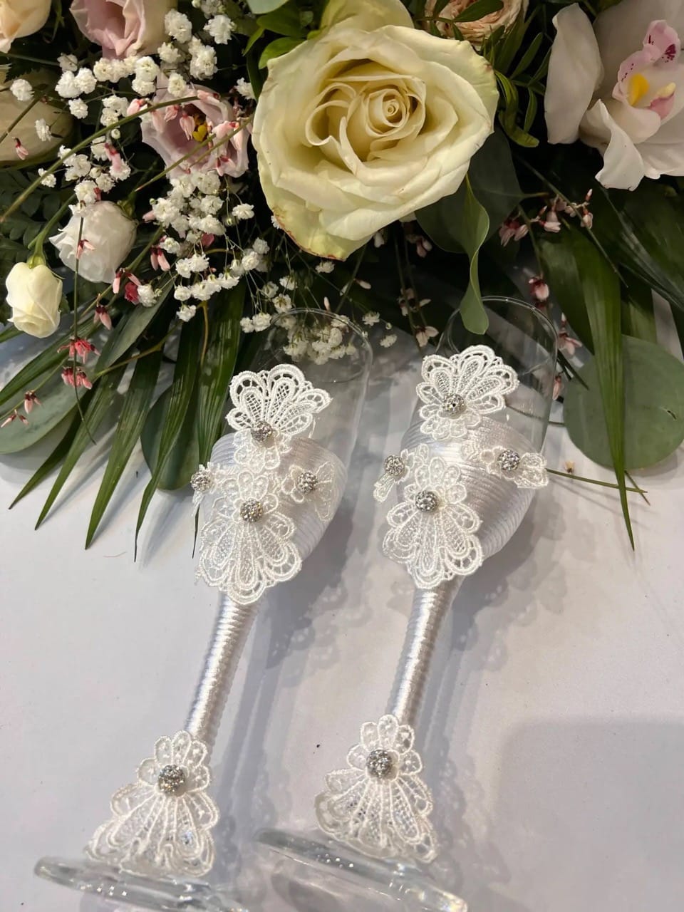 Páros esküvői pezsgős pohár szett csipkével és gyönggyel díszítve.