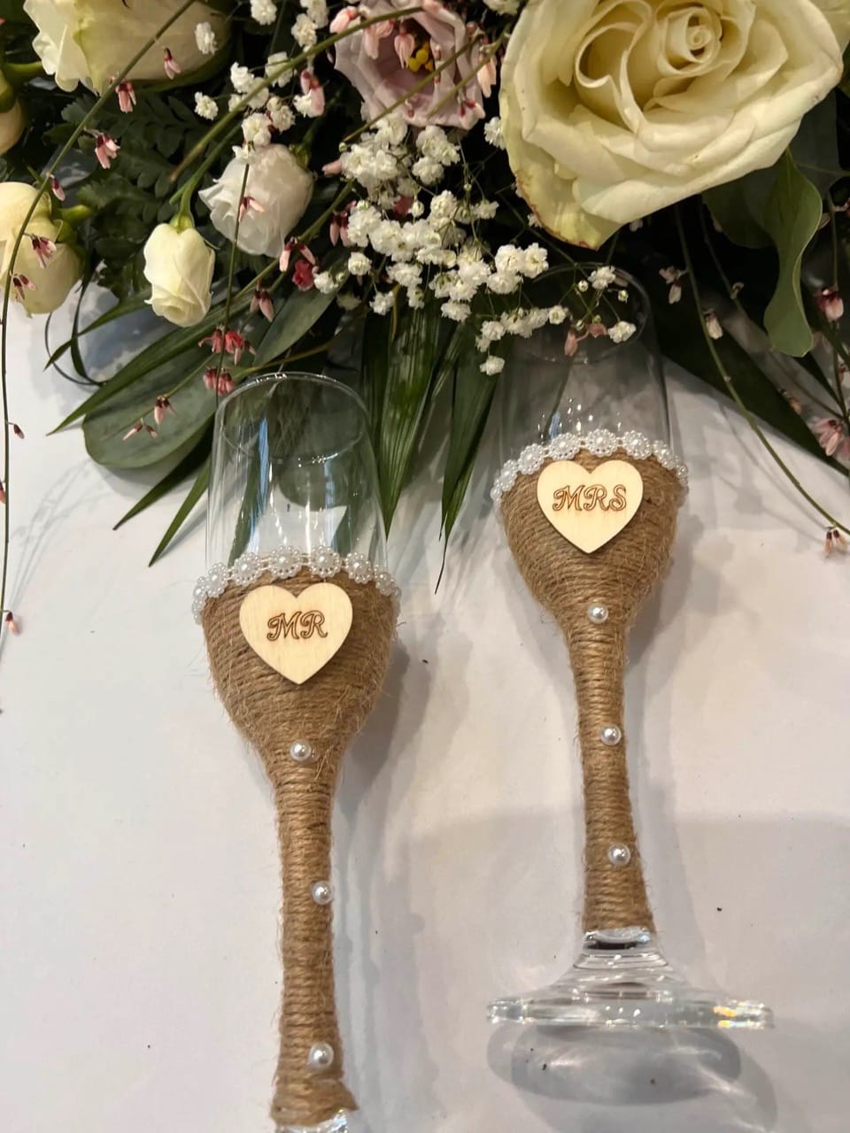 Páros pezsgős pohár, natúr természetközeli dekoráció